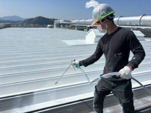 多気郡工場にて大型折板屋根の塗装工事|錆止め吹き付け施工