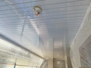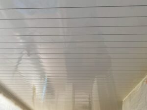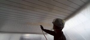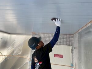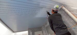吹き付けは細かい部分までムラなく均一に仕上げられるのが特徴で、特に軒天のような場所では仕上がりの美しさに大きな差が出ます。