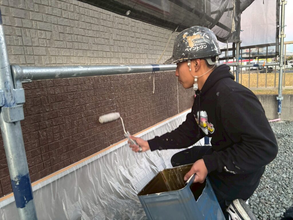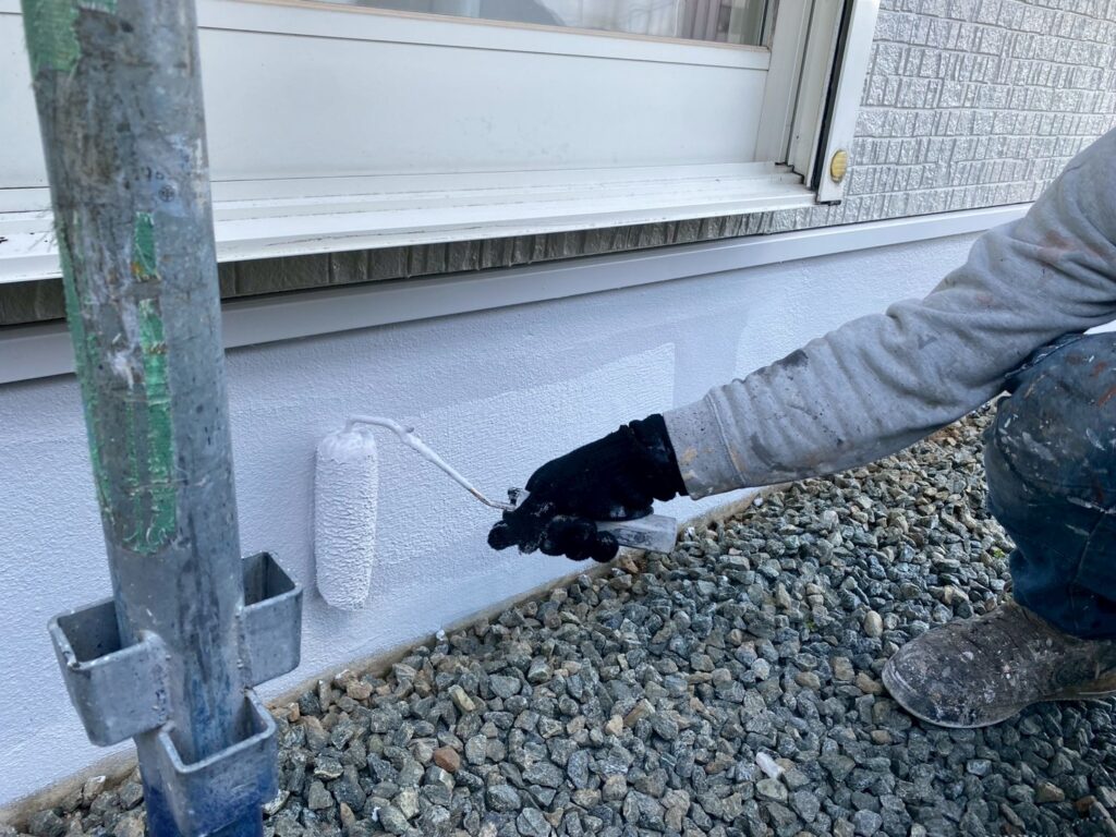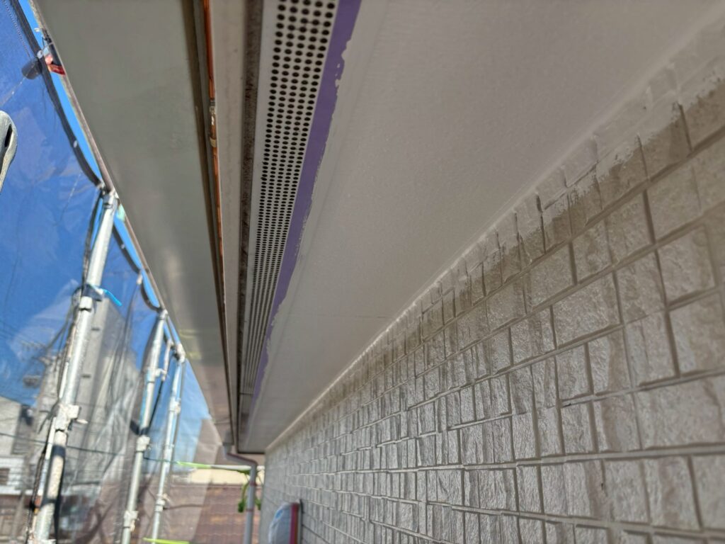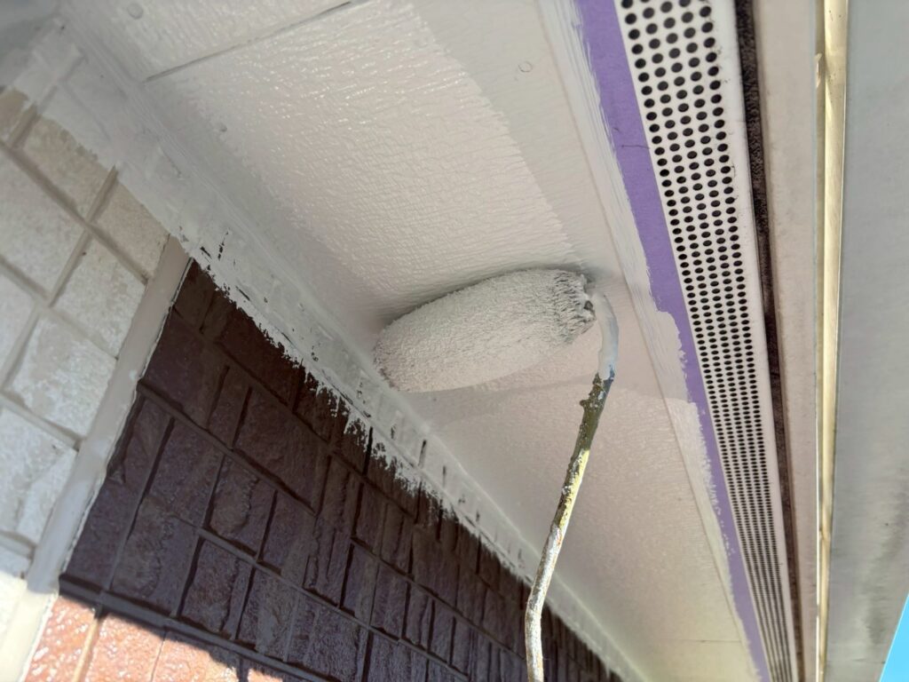 ケイカル板の軒天には透湿系の塗料を2回塗っていきます。