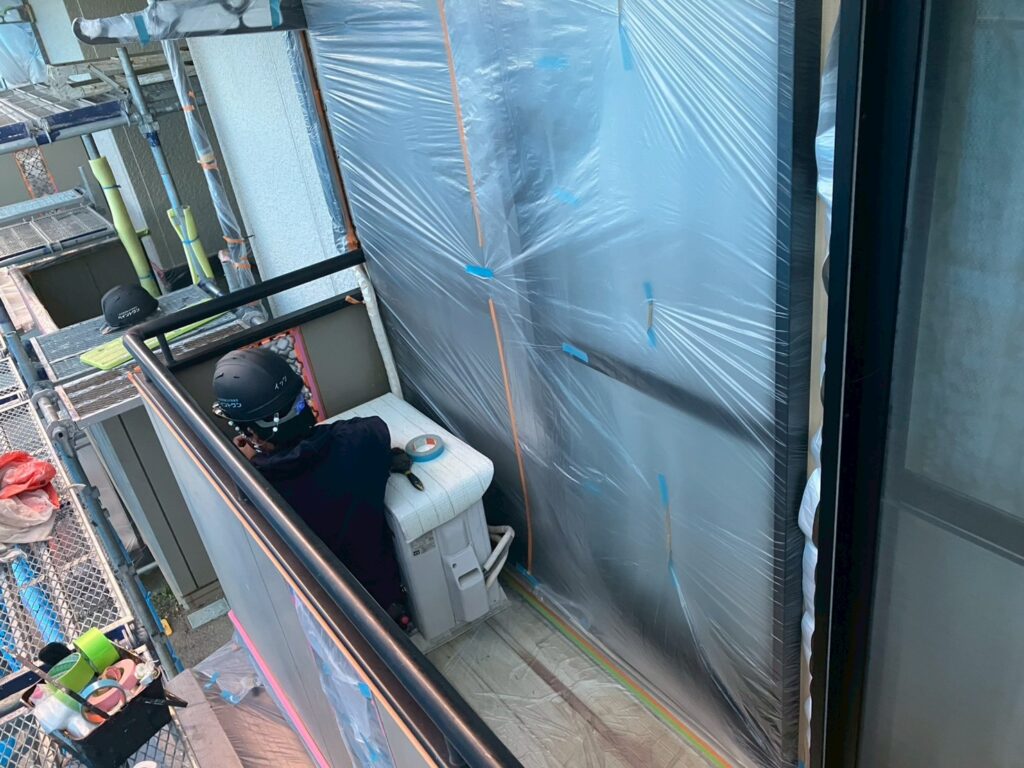塗料が付いてはいけないところをビニールで養生していきます。