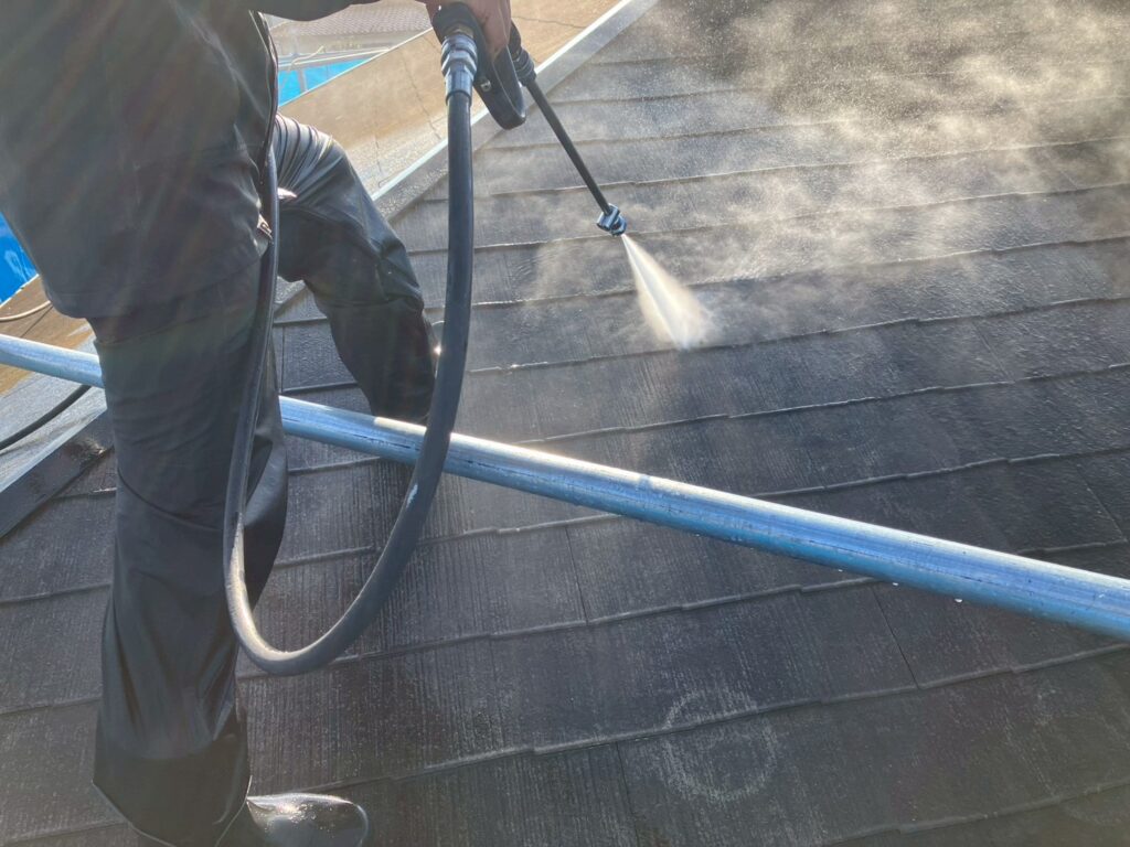 屋根を塗装する前のに、カラーベストに付着した汚れを綺麗に洗い流していきます。