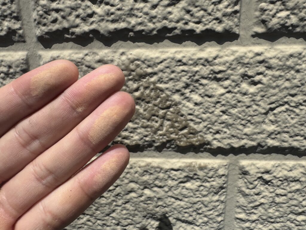 外壁にはチョーキングの粉やコケ・藻・長年のホコリ汚れなどが付着しています。