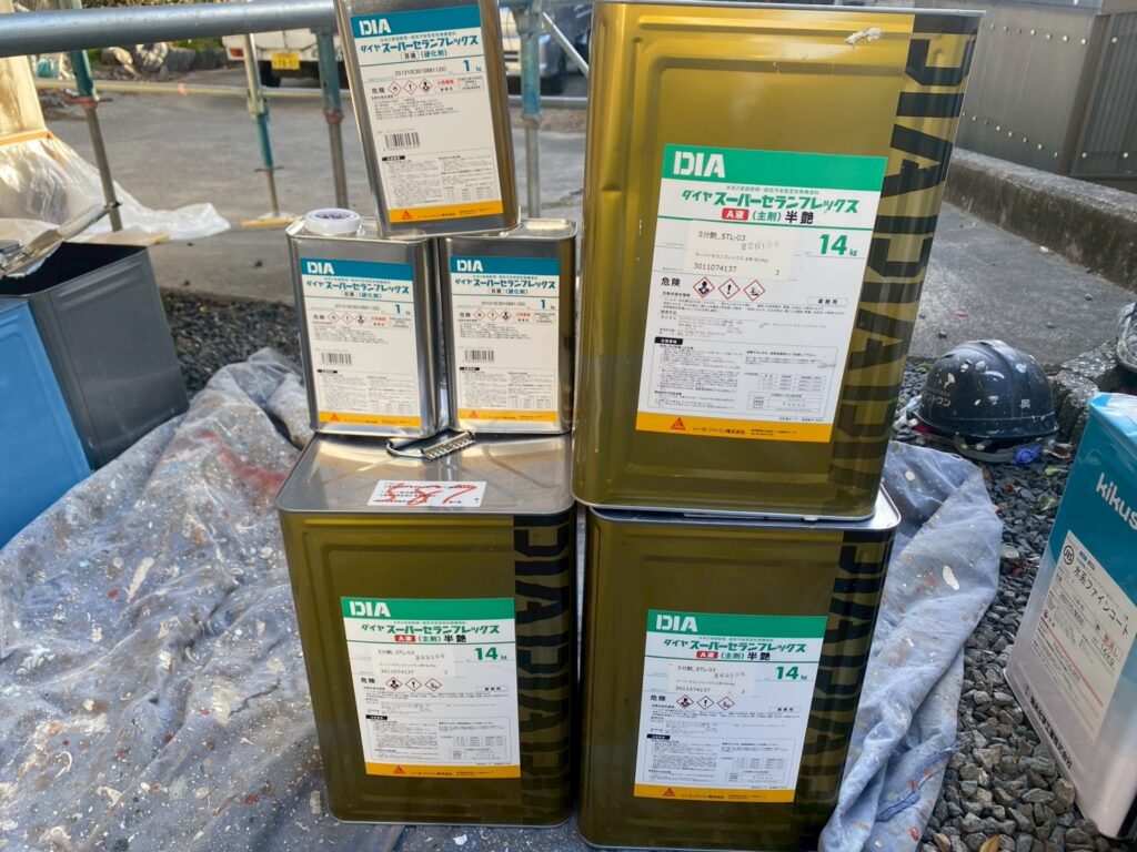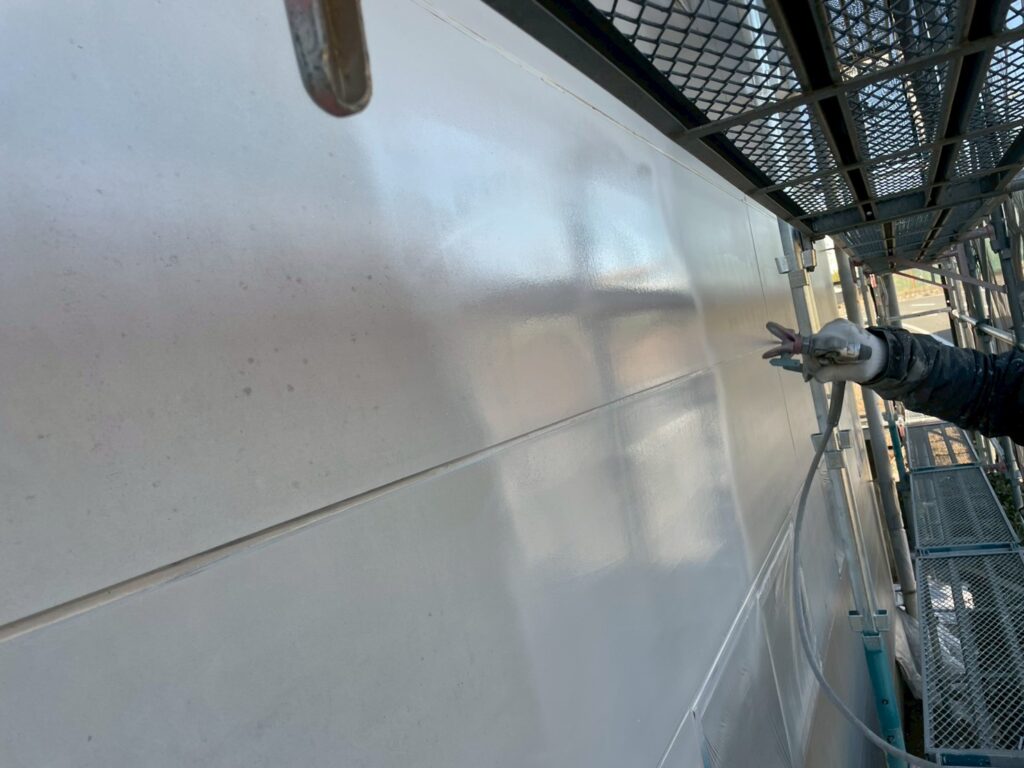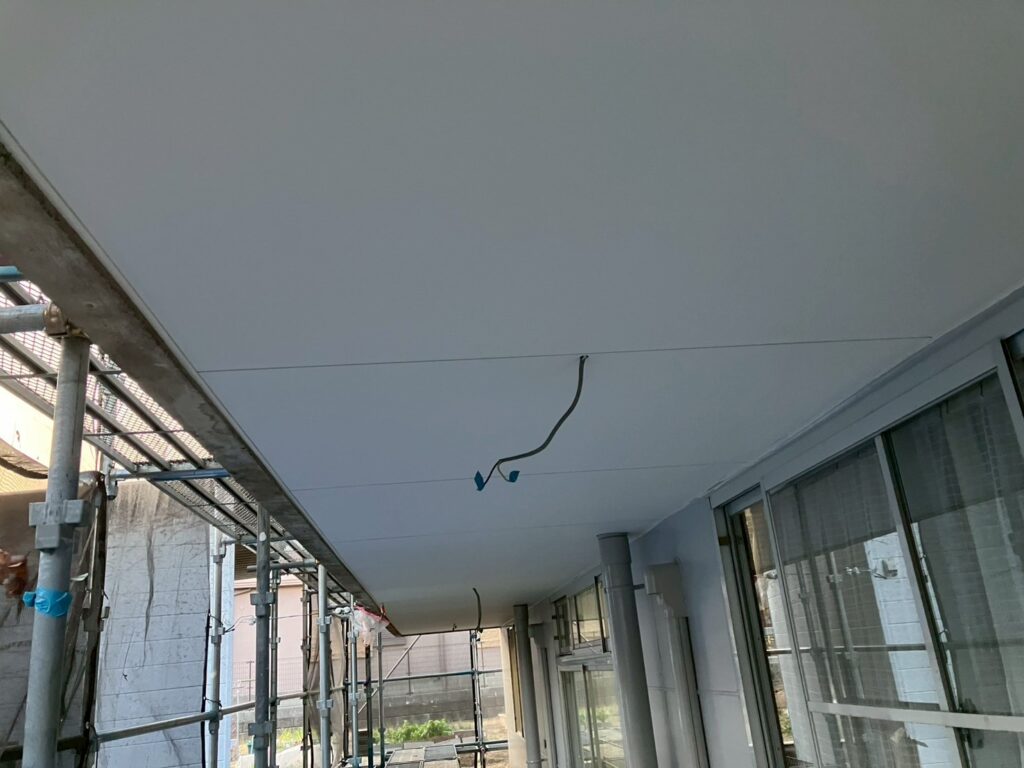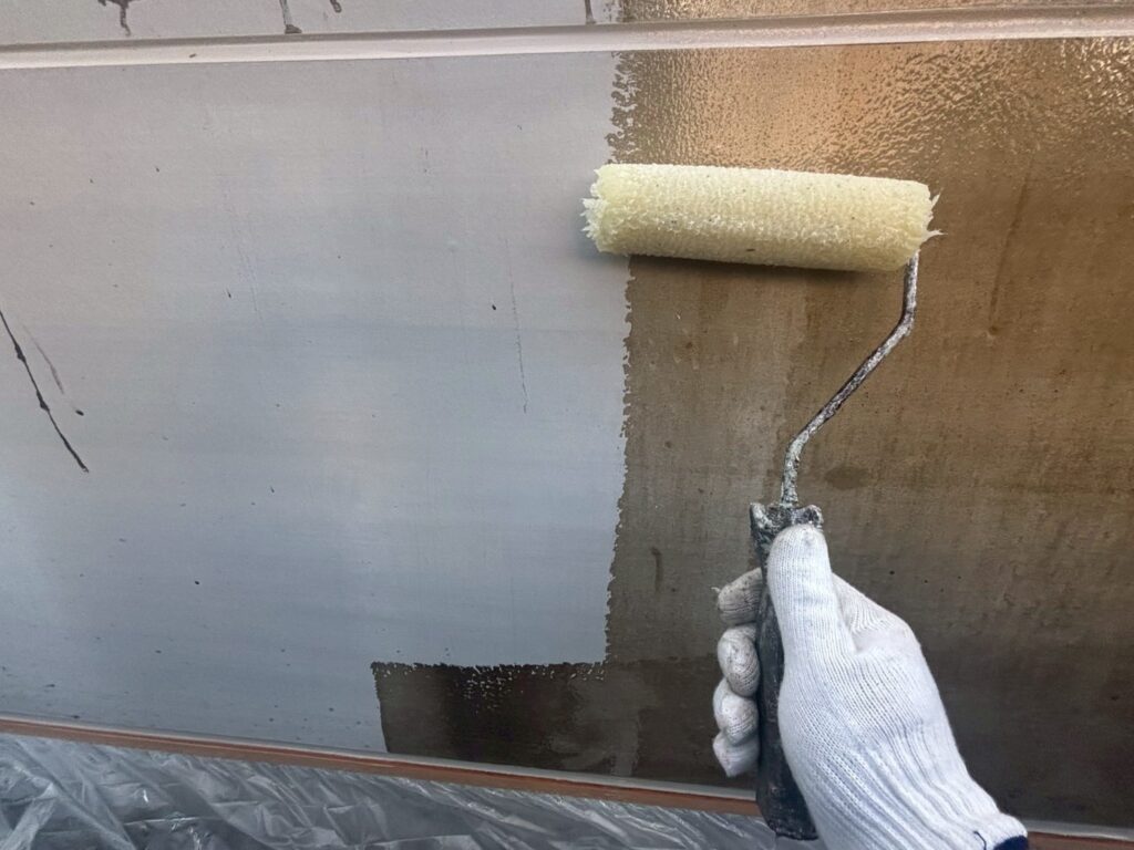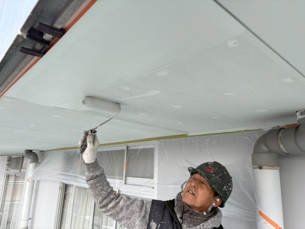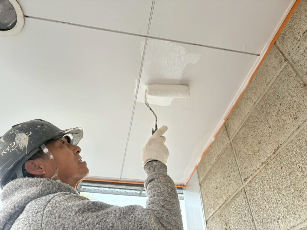 ケイカル板の軒天には透湿系の塗料を2回塗っていきます。