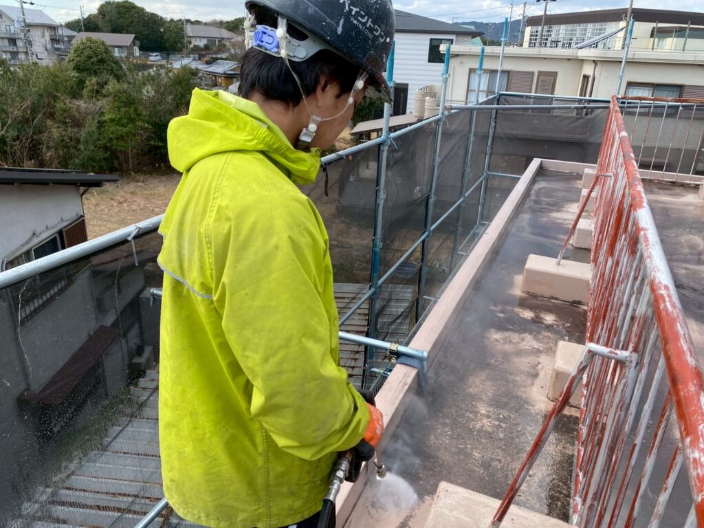 まずは既存の屋根を高圧洗浄機で洗っていきます。