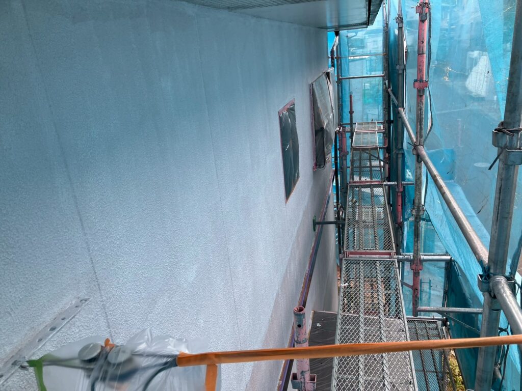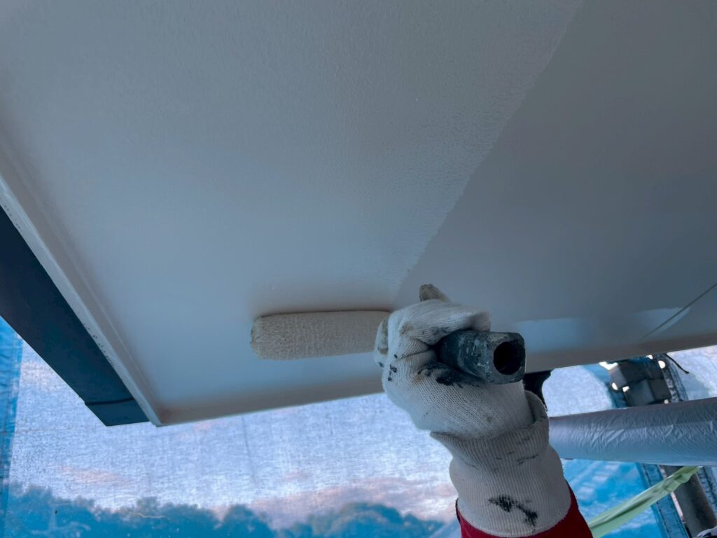 ケイカル板の軒天には透湿系の塗料を2回塗っていきます。