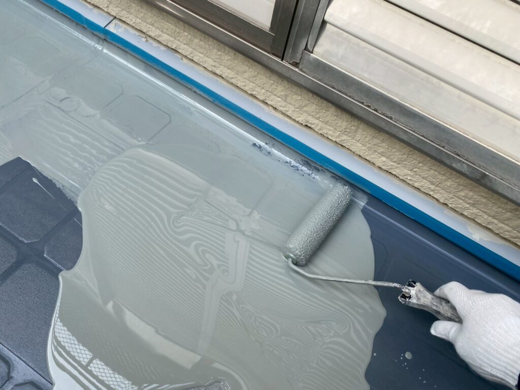ウレタン防水材は紫外線に弱く、汚れやすくもあるので、トップコートにて保護していきます。