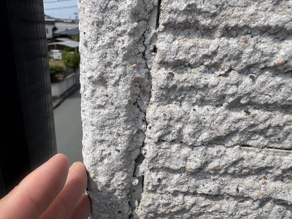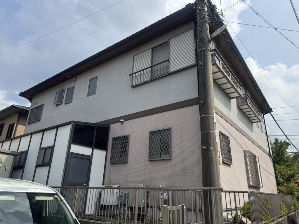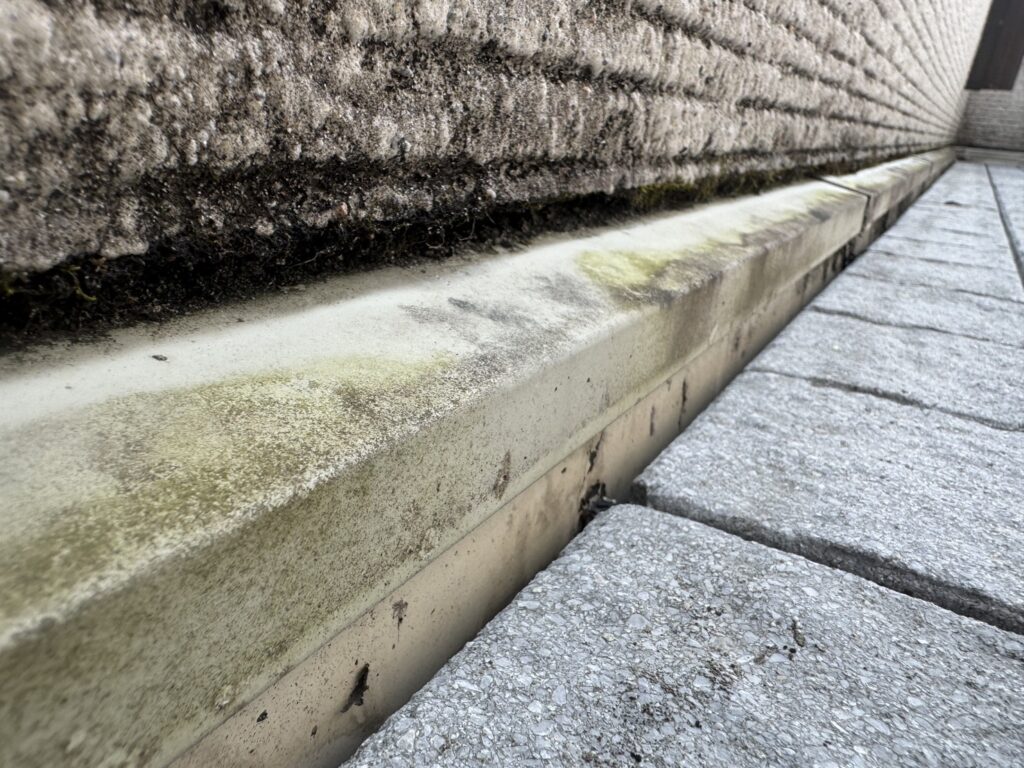 外壁にはチョーキングの粉やコケ・藻・長年のホコリ汚れなどが付着しています。