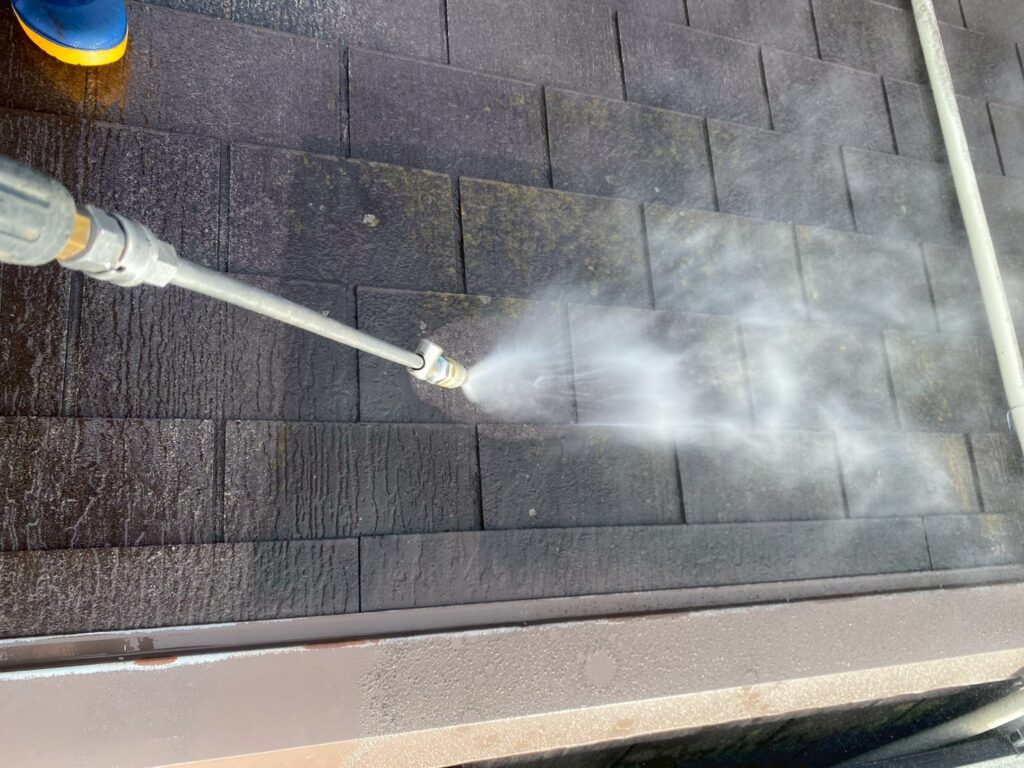 屋根を塗装する前のに、カラーベストに付着した汚れを綺麗に洗い流していきます。