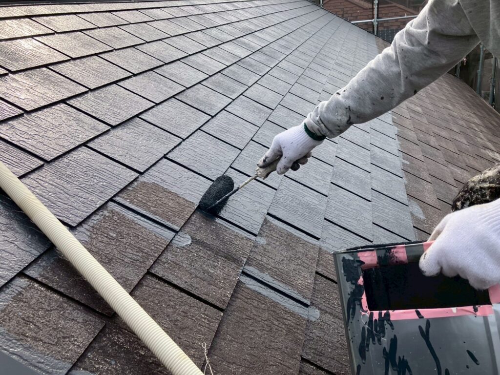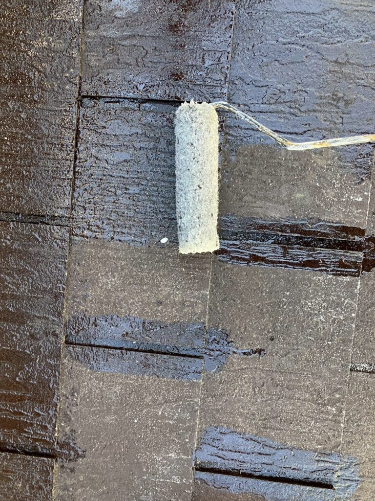 屋根材と塗料の密着を高めるため、下塗り材を塗布します。