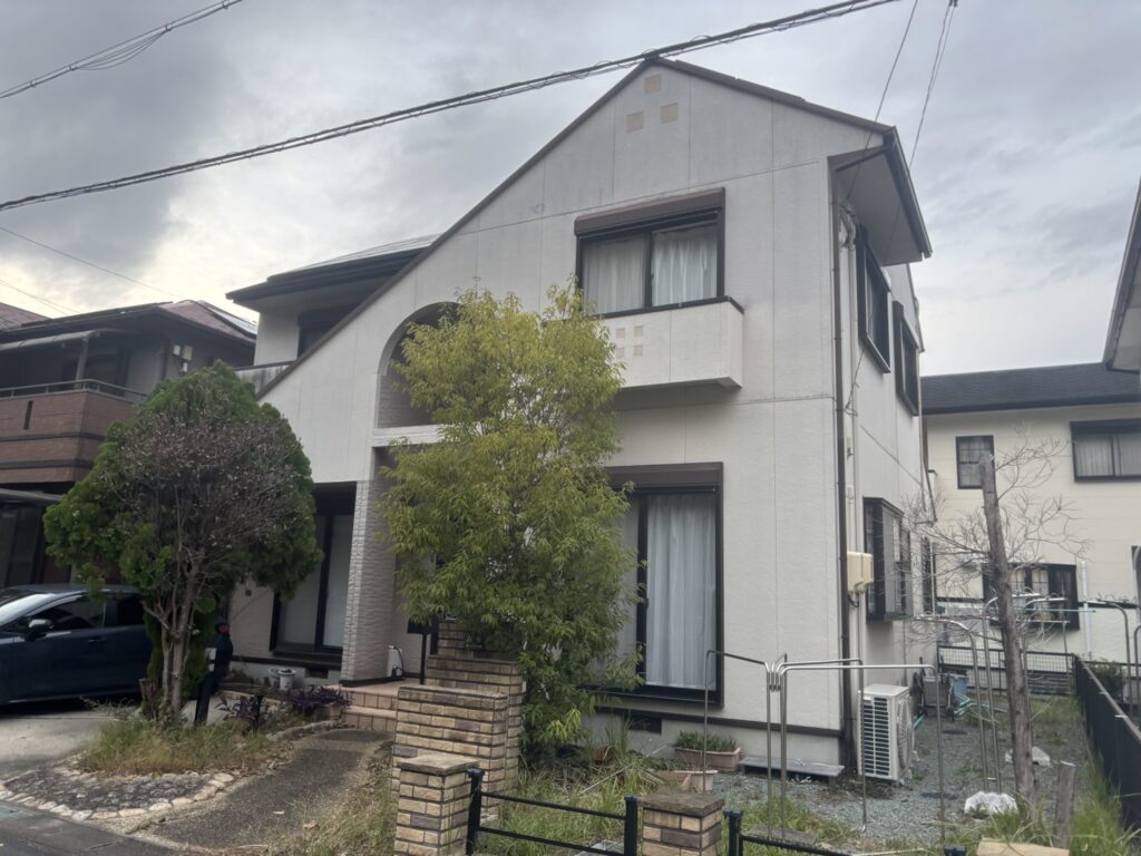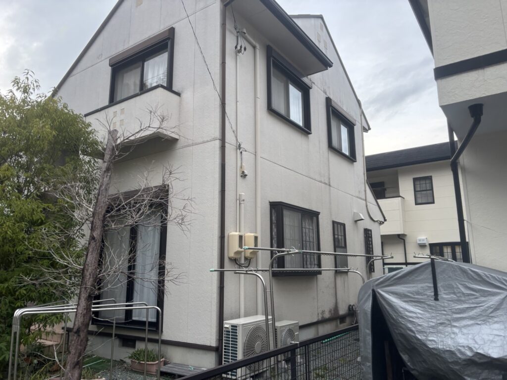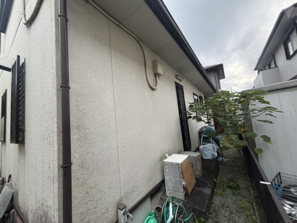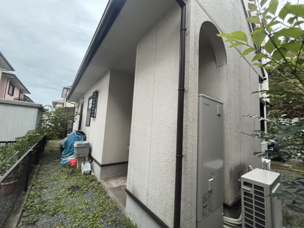 外壁にはチョーキングの粉やコケ・藻・長年のホコリ汚れなどが付着しています。