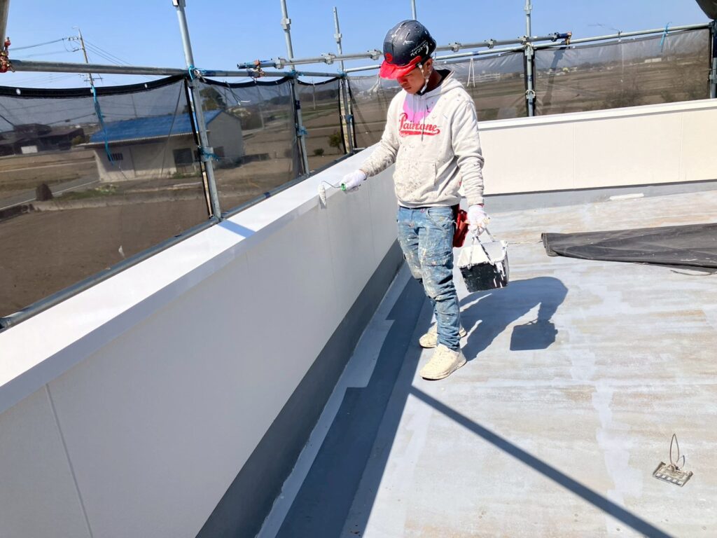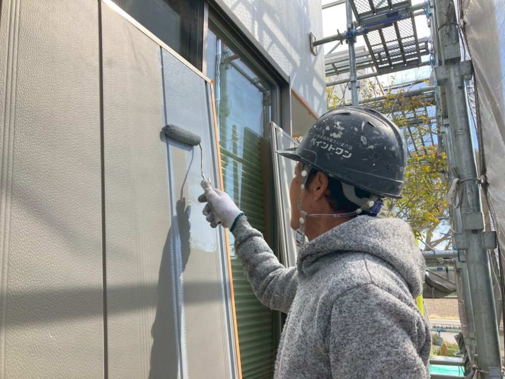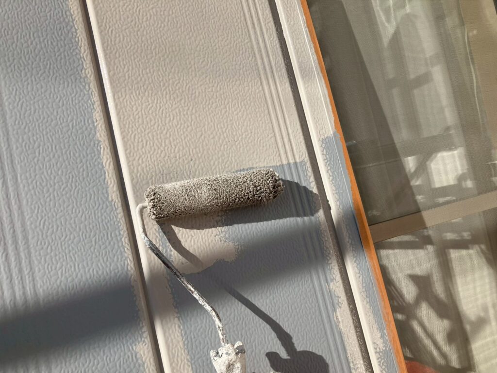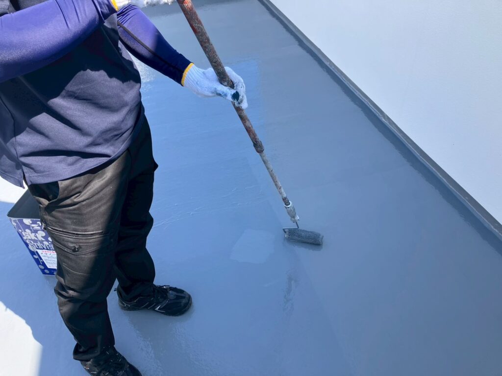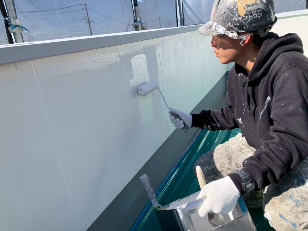 "中塗り後、規定の塗布量を守りながら上塗りを行い、塗膜の厚みと均一性を確保しました。これにより耐候性・防水性を最大限に引き出します。
