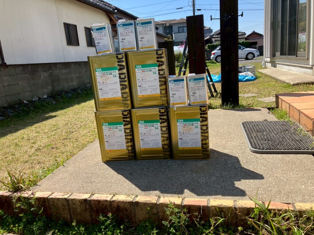 "今回の上塗り材は2液型高耐久無機塗料ダイヤスーパーセランフレックスを使用します。