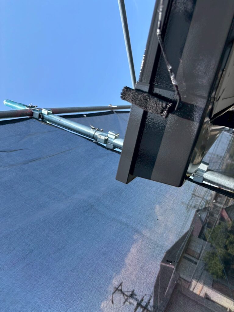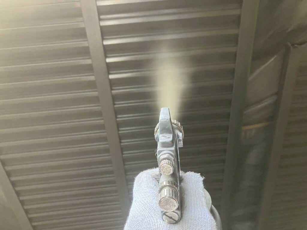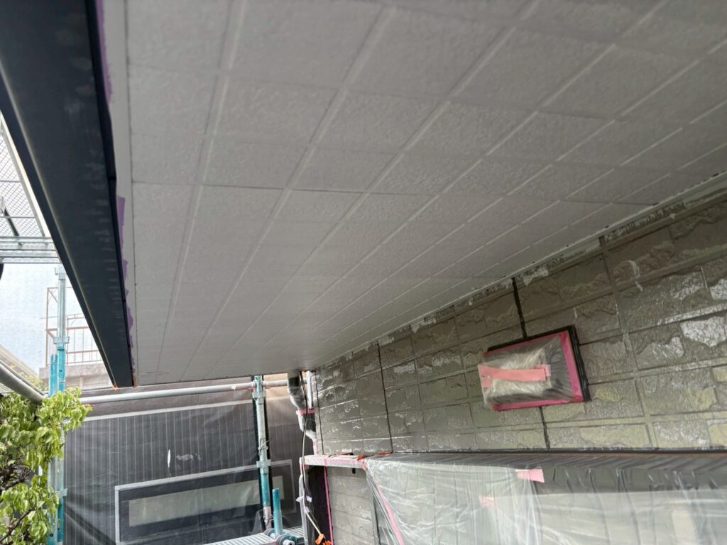 ケイカル板の軒天には透湿系の塗料を2回塗っていきます。