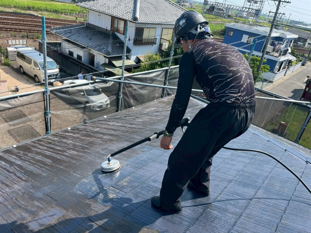 屋根を塗装する前のに、カラーベストに付着した汚れを綺麗に洗い流していきます。