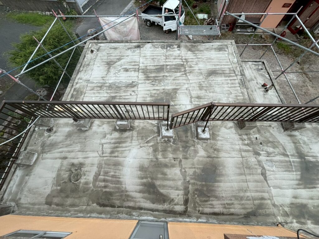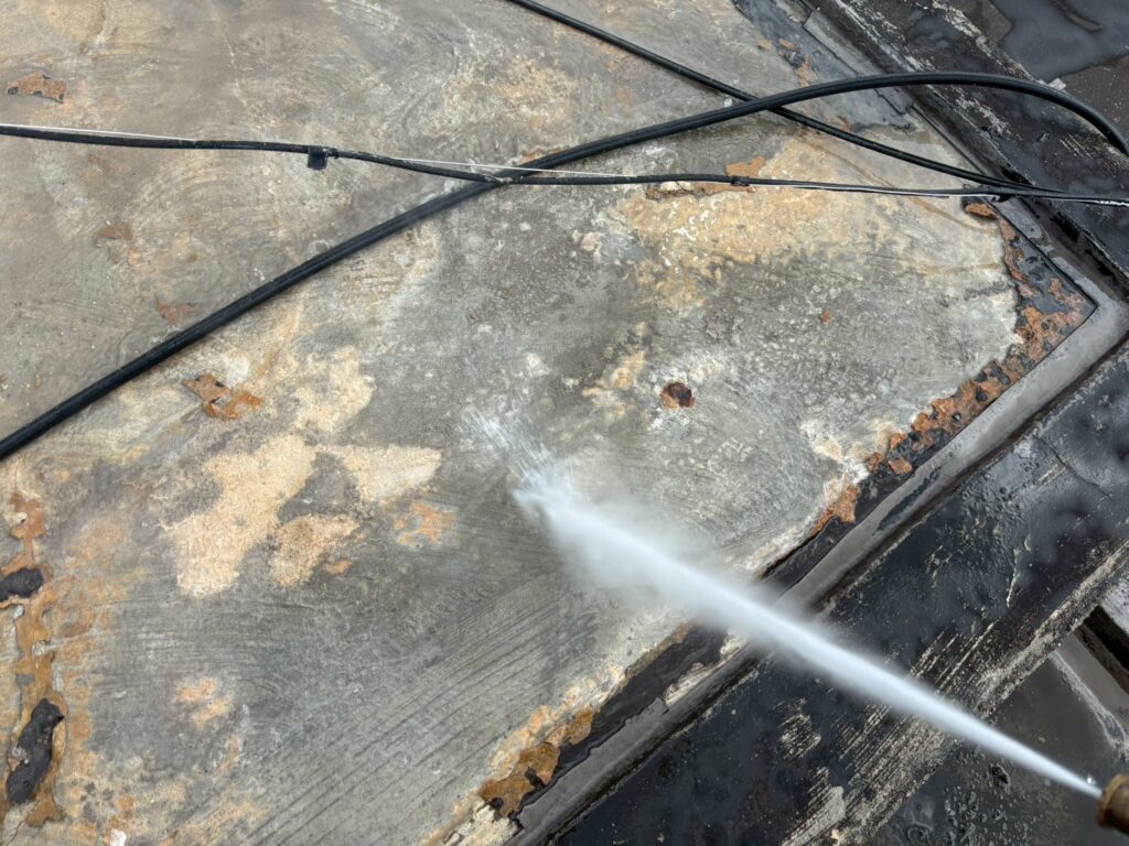 まずは防水材の密着性を上げるために高圧洗浄で汚れを落としていきます。